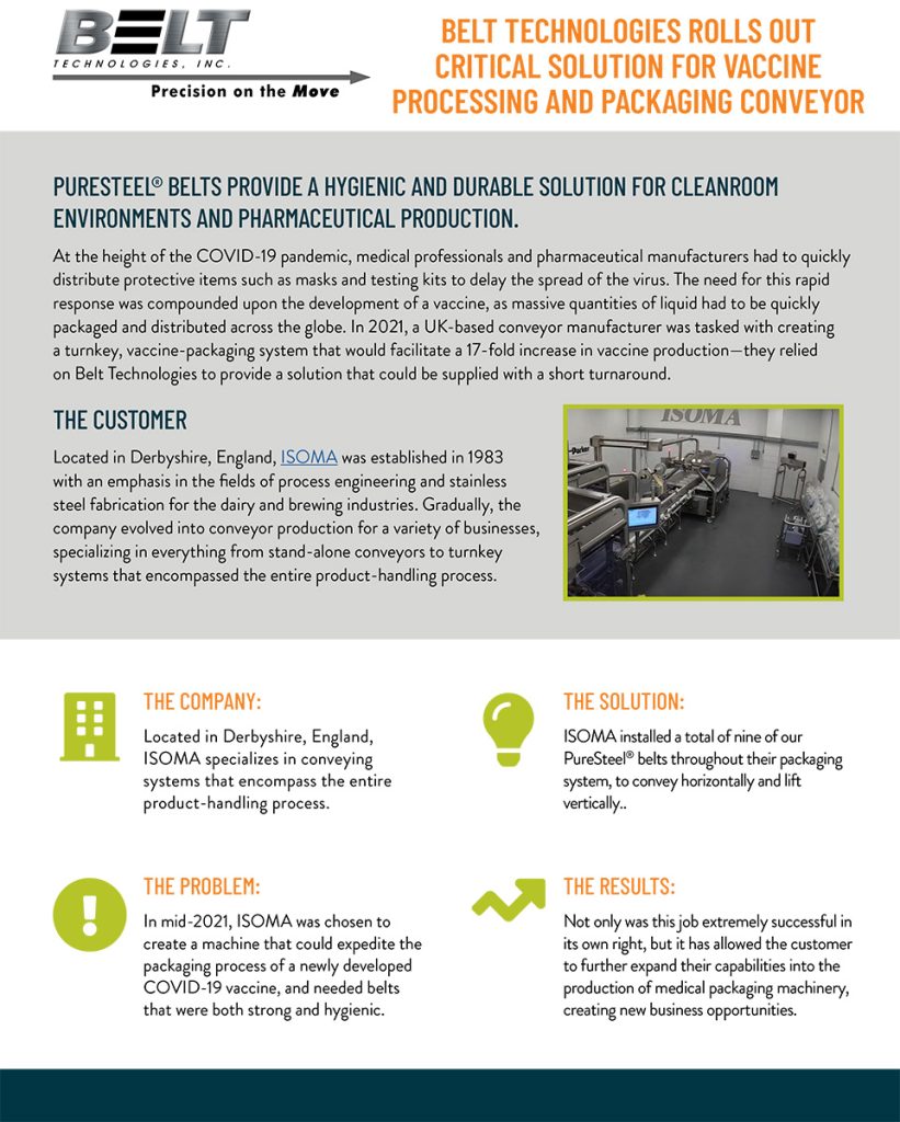 The Problem: In mid-2021, ISOMA was chosen to create a machine that could expedite the packaging process of a newly developed COVID-19 vaccine, and needed belts that were both strong and hygienic.