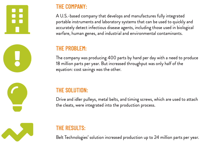 After investigating a variety of options, a metal belt conveyor system was chosen to replace the automation in place, with the belts and pulleys supplied by Belt Technologies. The result? Improved process times and more than that—with the new configuration, four separate products could be run on the same line, increasing profits and making strides in the medical field.