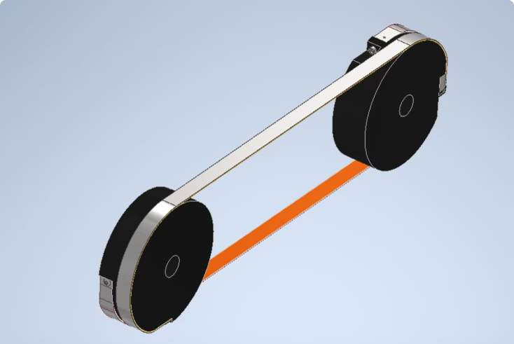 This drive system combines two pulleys (which may differ in diameter) and two tensioned PureSteel® MultiBands. The result is a rigid, zero-backlash system that supports high loads in compact spaces. The layered design allows the flexibility of thin bands for small pulleys while achieving the strength of a thicker cross-section—minimizing bending stress without compromising load capacity.